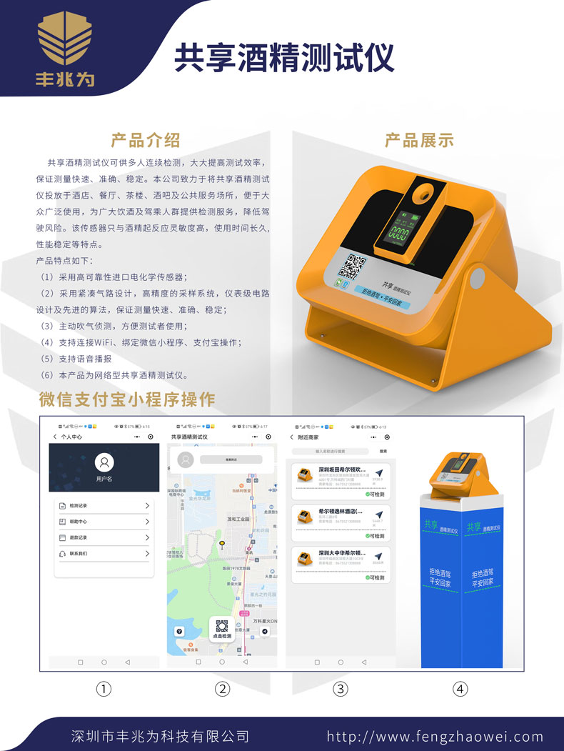 共享酒精測試儀豐兆為產品介紹產品展示共享酒精測試儀可供多人連續檢測,大大提高測試效率,保證測量快速、準確、穩定。本公司致力于將共享酒精測試儀投放于酒店、餐廳、茶樓、酒吧及公共服務場所,便于大眾廣泛使用,為廣大飲酒及駕乘人群提供檢測服務,降低駕駛風險。該傳感器只與酒精起反應靈敏度高,使用時間長久,性能穩定等特點。產品特點如下:(1)采用高可靠性進口電化學傳感器;(2)采用緊湊氣路設計,高精度的采樣系統,儀表級電路設計及先進的算法,保證測量快速、準確、穩定;(3)主動吹氣偵測,方便測試者使用;(4)支持連接WiFi、綁定微信小程序、支付寶操作;(5)支持語音播報(6)本產品為網絡型共享酒精測試儀。微信支付寶小程序操作個人中心共享酒精測試儀附近商家深圳坂田著爾頓歡.用戶名D可檢測檢測記錄希爾頓逸林酒店(...期助中心D可檢測進款記錄深圳大中華希爾頓..聯系我們樂用1970文拒絕酒駕拒絕酒駕D可檢測平安回家平安回家點出檢消口。